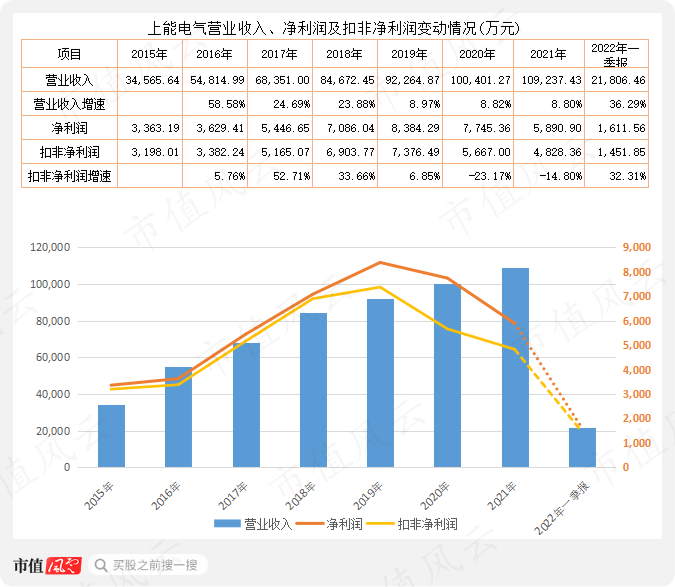 2021年,上能电气实现营业收入10.72亿元,同比增长了8.8%,实现扣非净利润4,828.36万元,同比下滑了14.80%。