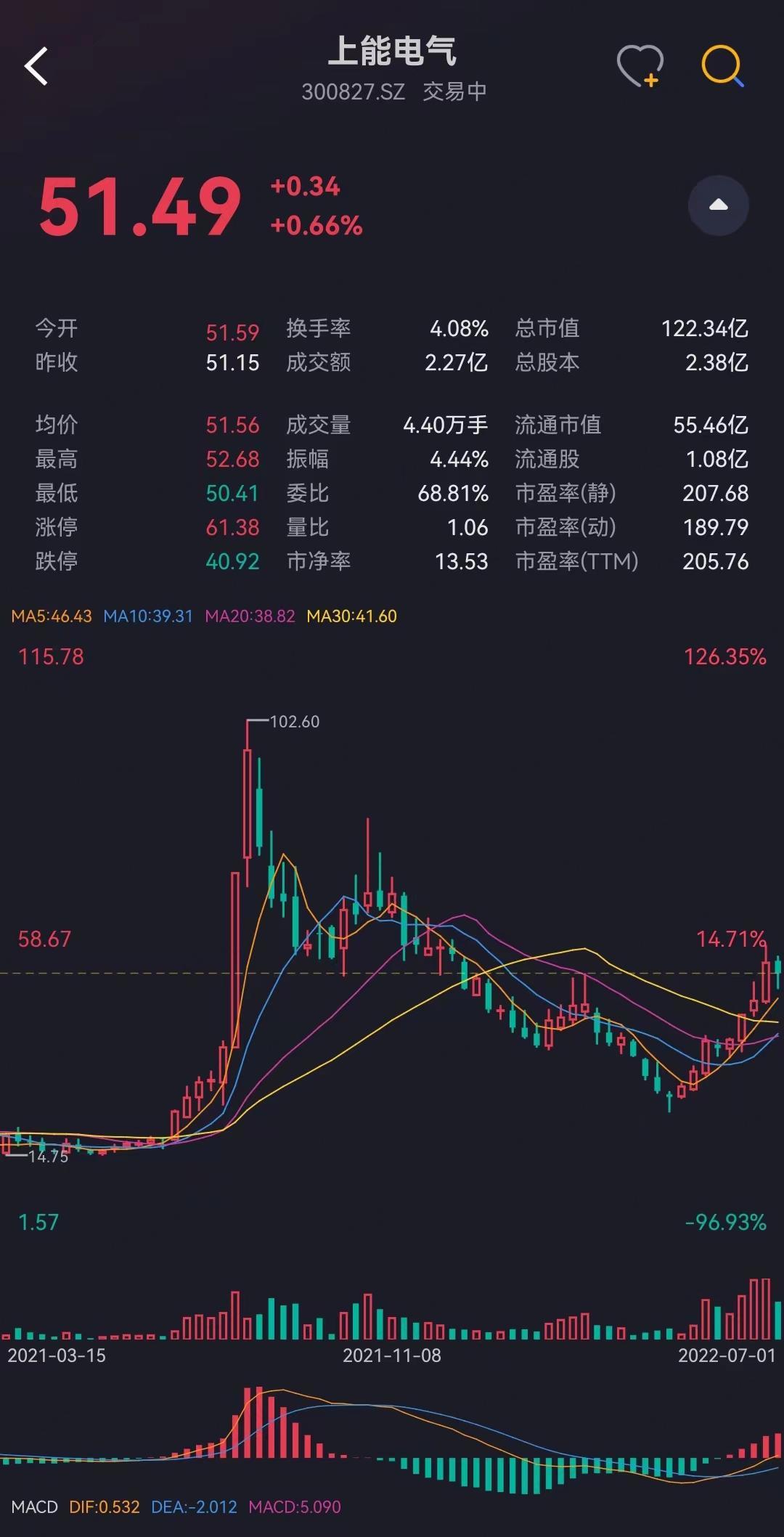 第三日(交易日),也就是7月22日,上能电气股价在午后突然快速拉升涨停,随之开启一轮快速上涨。