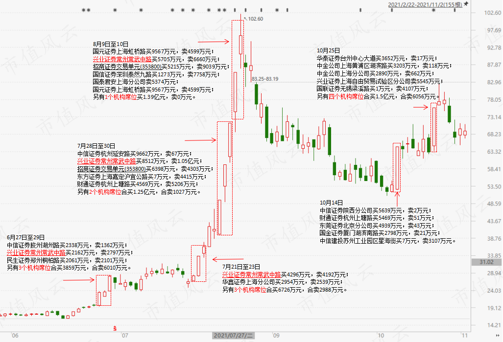 值得注意的是,2021年10月25日,还出现了4个买卖金额不同的机构专用席位,买入1.48亿元,卖出6056万元。