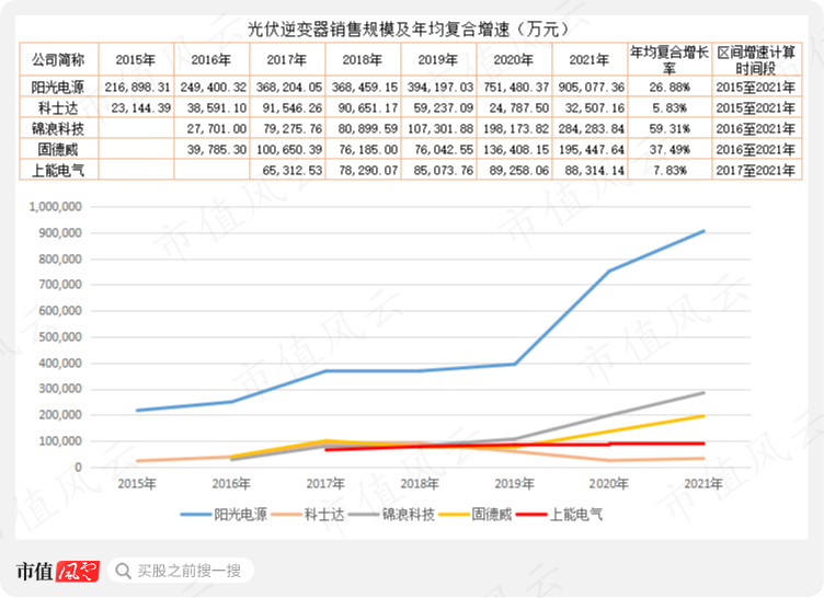 而从年均复合增长率看,锦浪科技排第一,固德威、阳光电源分列二、三位,上能电气2017-2021年的年均复合增速不到两位数。