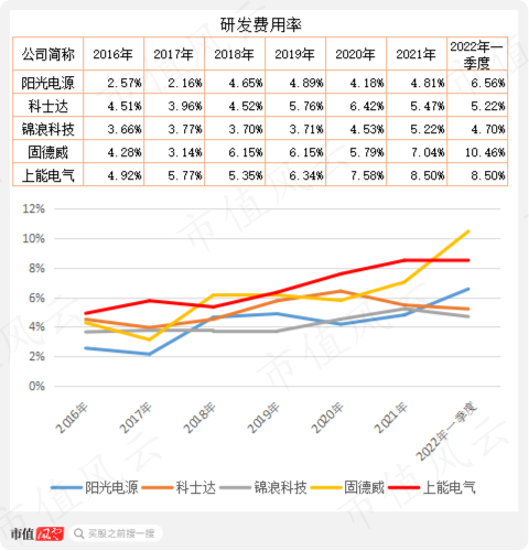 2018-2021年,阳光电源的研发费用率只有4.8%左右,科士达、锦浪科技则是在5%、4.5%左右,上能电气则一直高于6%,2021年为8.5%。