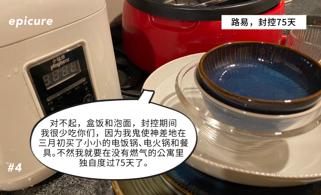 对不起,盒饭和泡面。封控期间我很少吃你们,因为我鬼使神差地在三月初买了小小的电饭锅、电火锅和餐具。不然我就要在没有燃气的公寓里独自度过75天了。