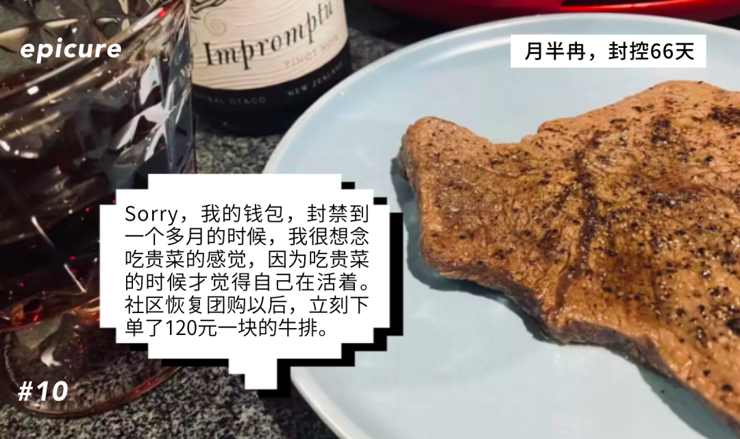 Sorry,我的钱包,封到一个多月的时候,我很想念吃贵菜的感觉,因为吃贵菜的时候才觉得自己在活着。社区恢复团购以后,立刻下单了120元一块的牛排。