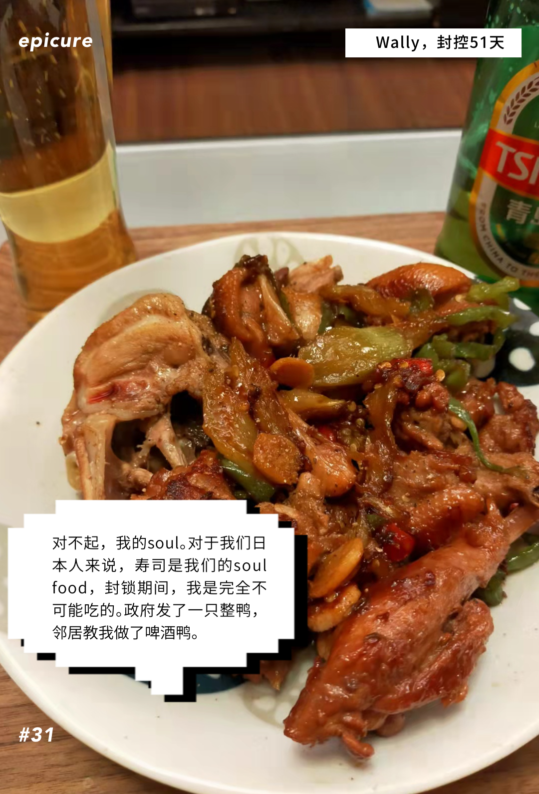 对不起,我的soul。对于我们日本人来说,寿司是我们的soul food,封锁期间,我是完全不可能吃的。比较难忘的体验是,政府发了一只整鸭,邻居教我做了啤酒鸭,可好吃了。