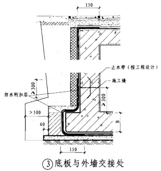 预留翻边为地下室外墙防水重点处理部位,也是地下室渗漏最易出现的部位,若处理不当将造成严重渗漏危害,其施工处理如图所示。