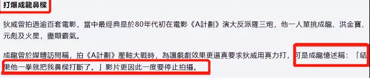 在以往的武打片中,狄威经常跟成龙、洪金宝、李连杰等武打巨星合作,一般都是他们当主角,狄威当里面的反派。不过他最令人印象深刻的角色肯定是他在电影《A计划》中扮演的“罗三炮”,在这部电影中,他独自挑战成龙、洪金宝、元彪三人,却也丝毫不落下风。甚至还在该影片的拍摄过程中,一拳将成龙的鼻梁打断,可见两位演员真的是十分敬业,投入度都很高。
