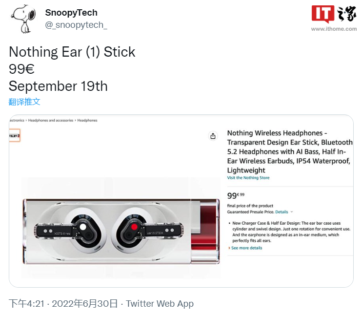 爆料者还放出了 Nothing Ear (1) Stick 的亚马逊商品页、泄露的价格和发布日期,称该耳机将于 9 月 19 日发布,售价 99 欧元(约 693 元人民币),与 Nothing Ear (1) 售价相同。