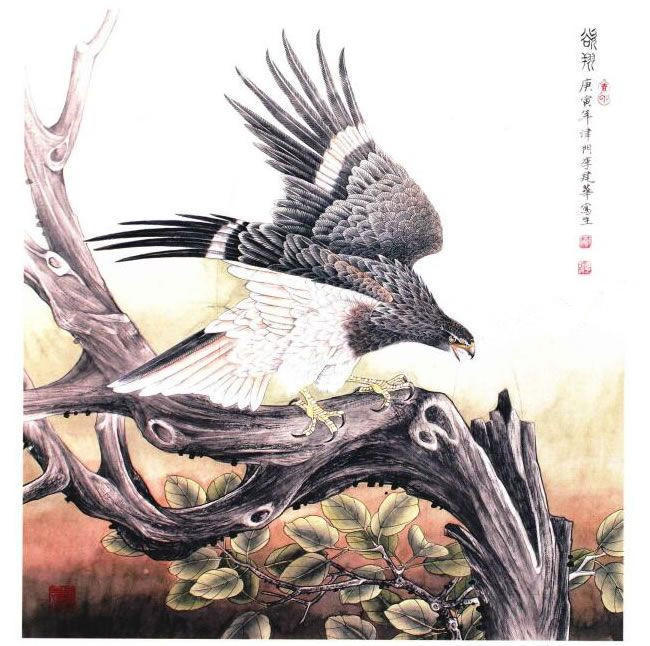 杜甫诗曰:“素练风霜起,苍鹰作画殊在中国民间之所以喜爱鹰这一绘画题材,主要是崇尚鹰的刚毅威猛,无所畏惧,姿态雄健,另外还寄寓着“鹏程万里”的美好企盼,故而将鹰称大鹏和雄鹰,作为绘画形象来表现。