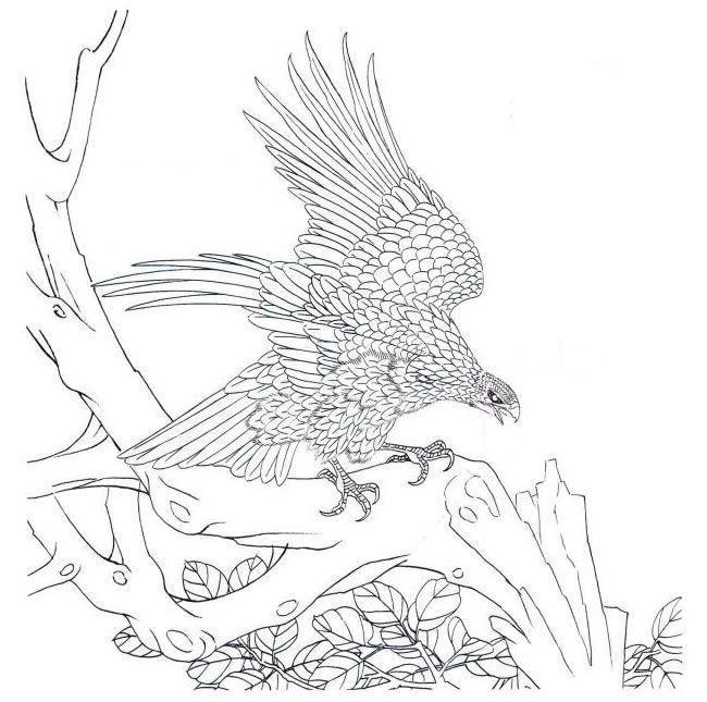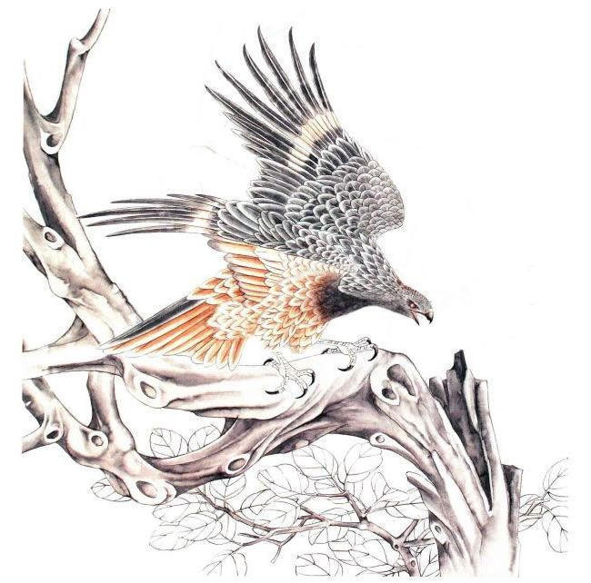 步骤二、采用花青色加淡墨调成花青墨色,分染鹰的黑色部分羽毛,反复多次,至满意止.。白色羽毛用赭石色加花青色配成合成色分染,淡墨分染眼、嘴、爪,中墨皴出树木,阳光水分干一点,暗部水分大一点,用笔侧锋进行披麻皴,注意用笔要果断,一挥而就,平时要多练习。