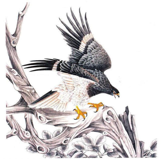 这幅是以猛禽类中“鹤”为形象来创作的。鹤,中型猛禽,飞羽有明显白色横带,站立时有独特的冠羽。腹部呈白色,胸近黑色,嘴黑色,眼、鼻、趾爪黄色,常停在浅水处的木桩上,觅食时会在水面上定点振翅,俯冲而下,捕取猎物。
