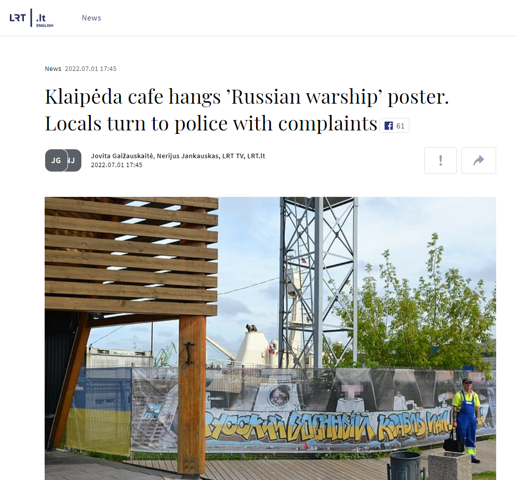 据立陶宛国家广播电视台(LRT)7月1日报道,立陶宛第三大城市克莱佩达一家餐厅挂出一幅海报,上面写着“俄罗斯军舰,去你X的”。但这幅海报很快引起一些人不满,报道说,有当地人向警方和市政府投诉。