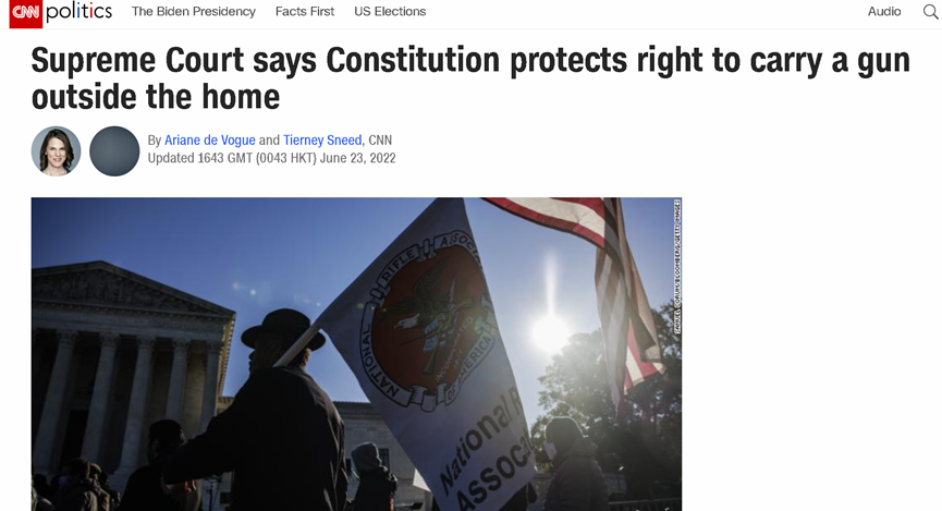 根据美国有线电视新闻网(CNN)和纽约当地媒体的报道,当地时间6月23日,被美国保守派掌控的美国最高法,裁定纽约州在1913年设立的一则限制枪支的法律“违宪”,侵犯了美国宪法第二修正案赋予民众的持枪权利。