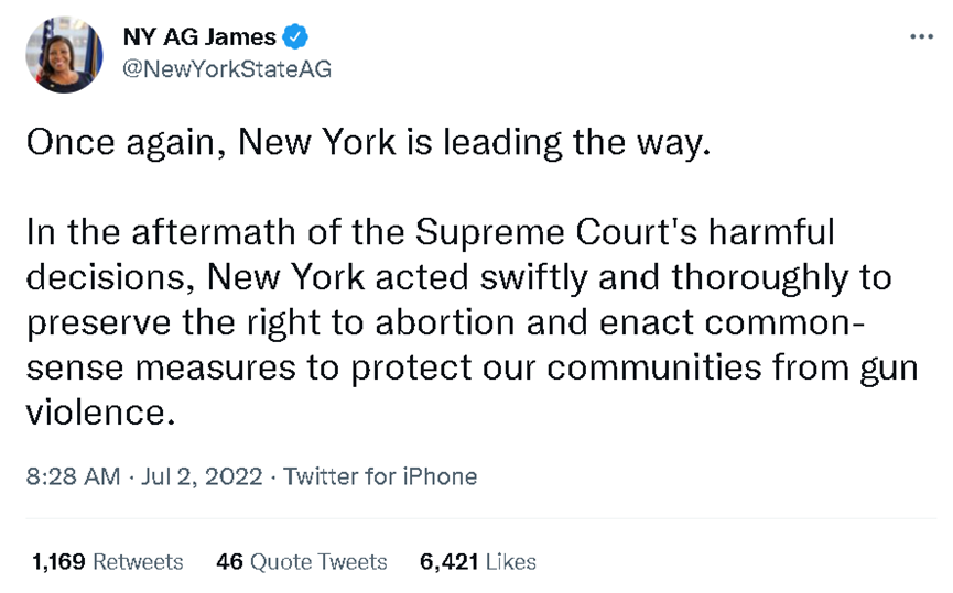 如下图所示,纽约州的总检察长利蒂希娅·詹姆斯(Letitia James)就在她的社交账号上表示,纽约州迅速通过的法律,就是为了在最高法做出的伤害性的裁决后,给民众提供保护的。