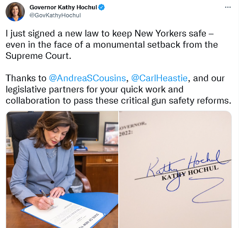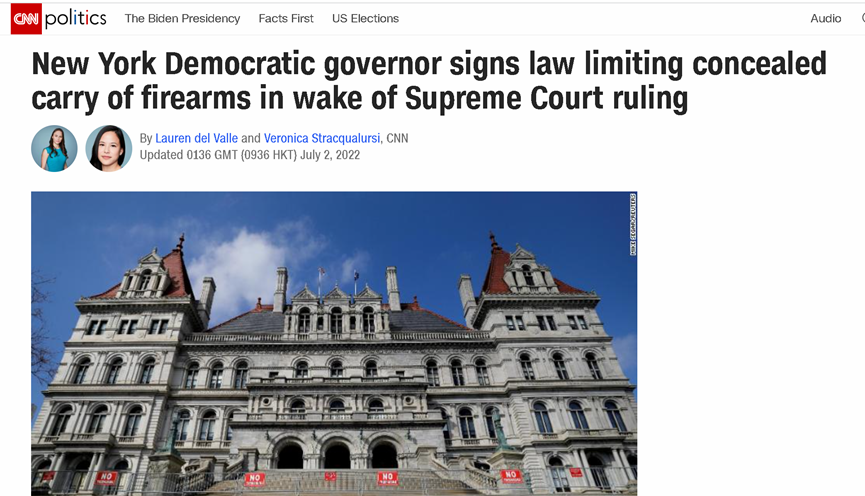 不过,虽然纽约州政府表示会服从最高法的裁决,但在这个民主党自由派占多数的州,不论是州长还是州议会的多数议员,都认为限制枪支使用才是正道。于是,在最高法于23日做出裁定后,纽约州的议会和州长也立刻行动了起来,希望通过新的法律来限制枪支的使用,堵上被最高法裁决撕开的控枪口子。