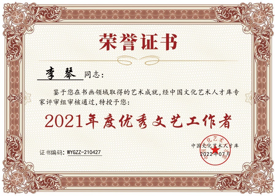 鉴于李琴女士在书画领域取得的优异成就,经中国文化艺术人才库专家评审组审核通过,授予其“2021年度优秀文艺工作者”荣誉称号。