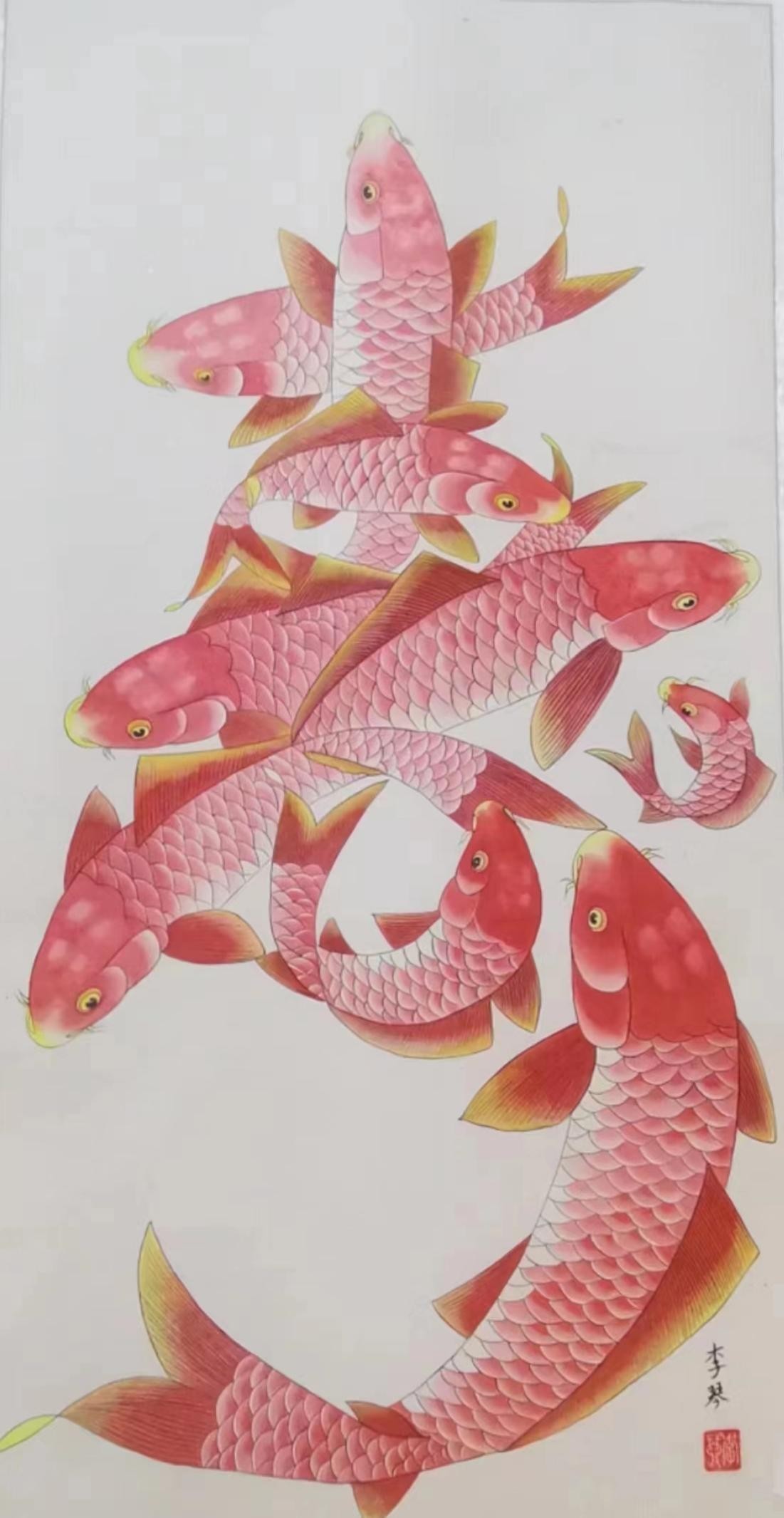 作品讲述:九鱼图是具有吉祥如意寓意的国画。自古“九”就有长久之意。“鱼”则为万事如意。九条可爱的锦鲤在水中嬉闹,寓意着长久的吉祥如意。鱼文化不仅在中国广为流传,在东南亚各国同样深入人心、家喻户晓,九鱼图就成为千家万户所喜爱的国画。