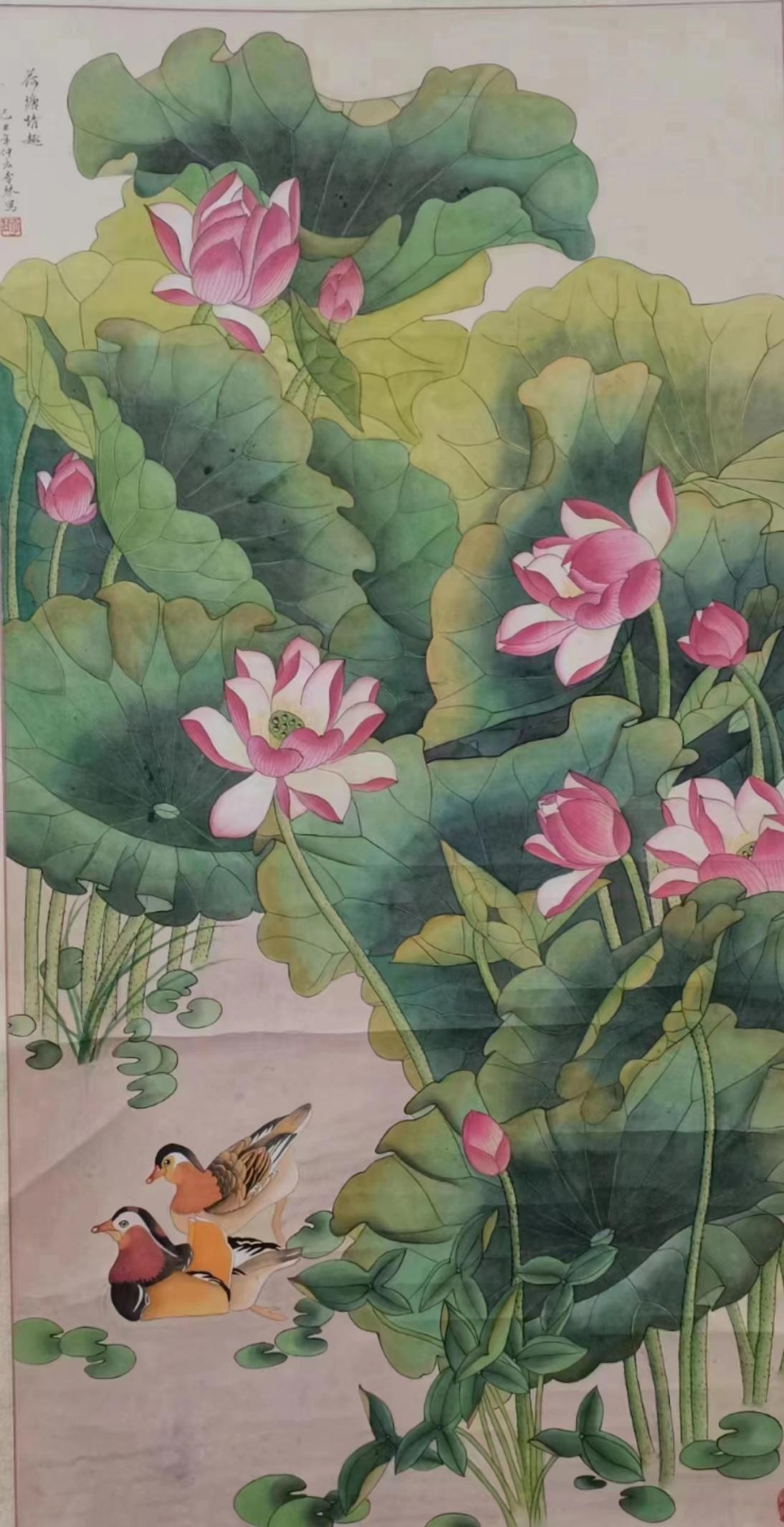作品讲述:此作品寓意深远,风格独特,画中荷花淡雅髙贵,体现了很高的艺术境界。还有一对美丽可爱的小鸳鸯乐在其中,是此画点晴之笔,妙不可言!与此佳作结缘,彰显品位与价值!