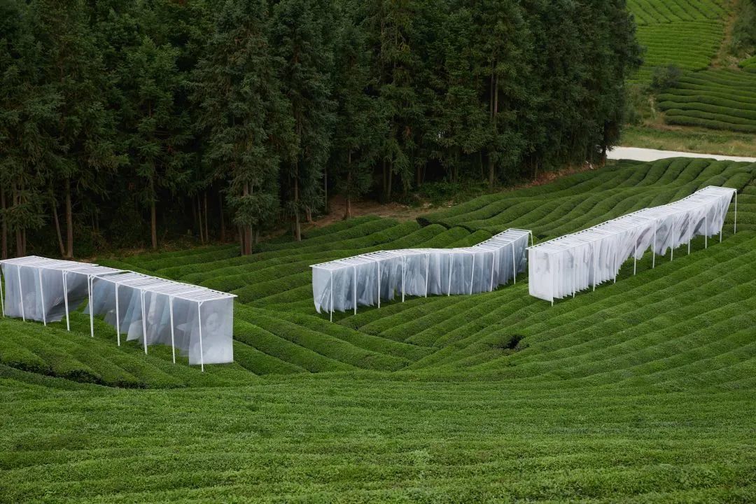 △ 摄影艺术厂牌“人像图书馆”的作品《茶田守望者》,把许多张人像摄影作品排列在茶田中,为了不破坏茶树的生长,创作者尽可能减少了挂画布的架子插入茶田的长度。摄影 | 人像图书馆