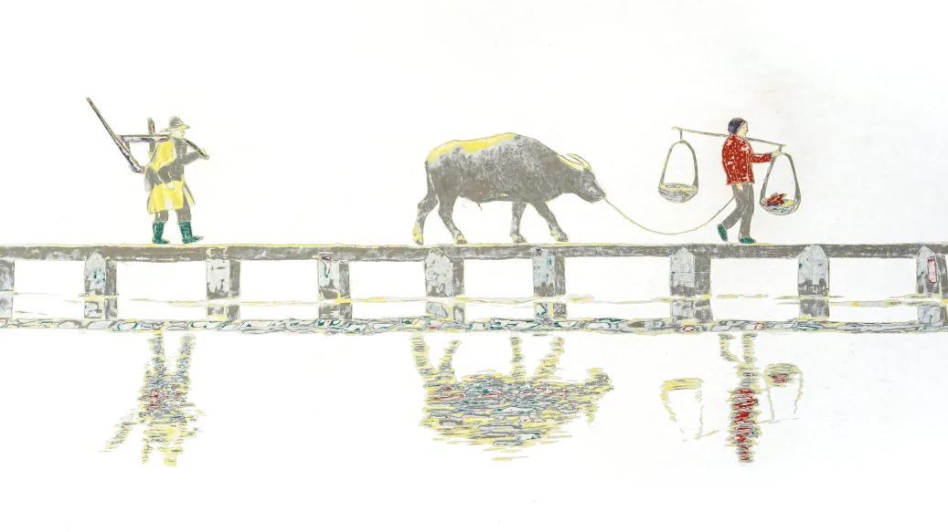 △ 粮仓中的摄影和画展《我·家·乡》以寒溪村村民的移民故事为蓝本,由 3 位来自不同领域的艺术家创作:作家倪倪创作了纪录片《我·家·乡》,摄影师霍城拍摄了村民的特写,插画师于瑒以这些肖像为原型创作了插画。摄影 | 刘新征