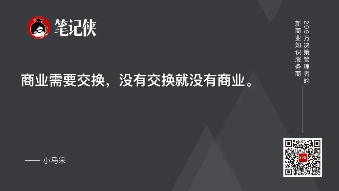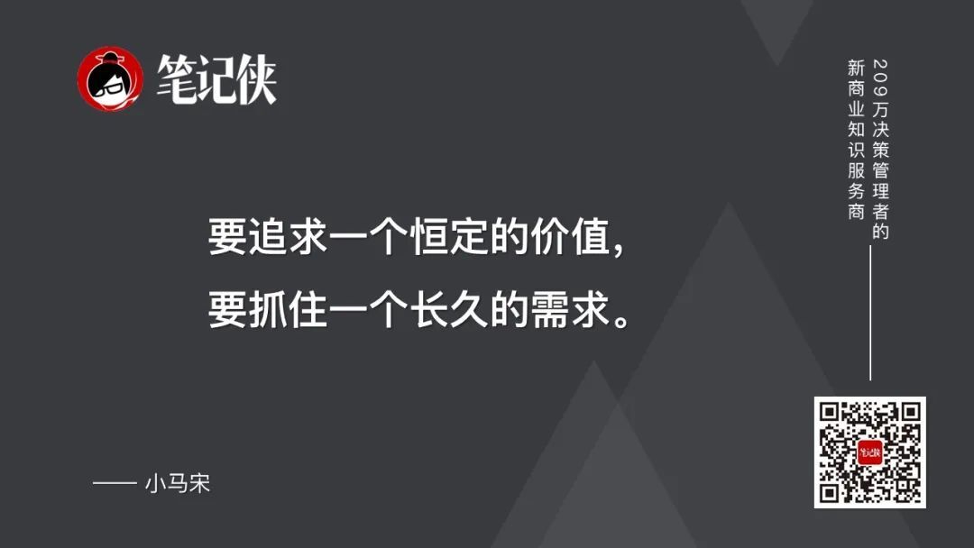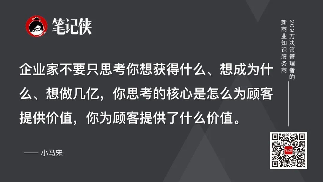小马宋(知名战略营销专家):企业家不要只思考你想获得什么、想成为什么、想做几亿,你思考的核心是怎么为顾客提供价值,你为顾客提供了什么价值。只要你的价值足够,最后一定会出来,一定会被认可。