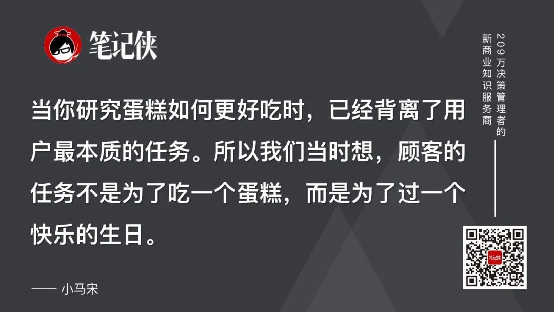 我们真正去思考用户买一个生日蛋糕,究竟是为了啥?如果说他想吃蛋糕的话,他不会买一个生日蛋糕。生日蛋糕的本质,是为了过生日。他想完成的任务是插上蜡烛、许愿、拍照、分享。