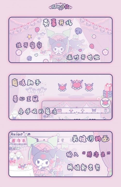 这一次合作的酷洛米·糖心派对超级皮肤,讯飞输入法以内容与视觉设计撬动用户体验。首先映入眼帘的是荧幕开场,动画拉开窗帘寓意输入派对的开始;其次,输入界面以粉紫为色调,承托出酷洛米甜酷叛逆的形象,并以角色性格不断结构、组合、延伸、诠释,创作出带有“魔力”的键盘。值得一提的是,AI助手化身魔法助手,将酷炫“黑魔法”与现实场景结合,还叠加AI输入技能,通过创意的动效将AI赋能的产品价值传达给用户,在新奇的互动体验中获得更多粉丝的青睐。此外,使用这款宝藏皮肤输入“酷洛米”,还可解锁关键词的动画,带来满满惊喜感。
