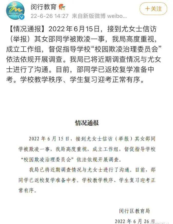 ▲上海市闽行区教育局在6月26日发了官方声明,成立工作组,调查此事