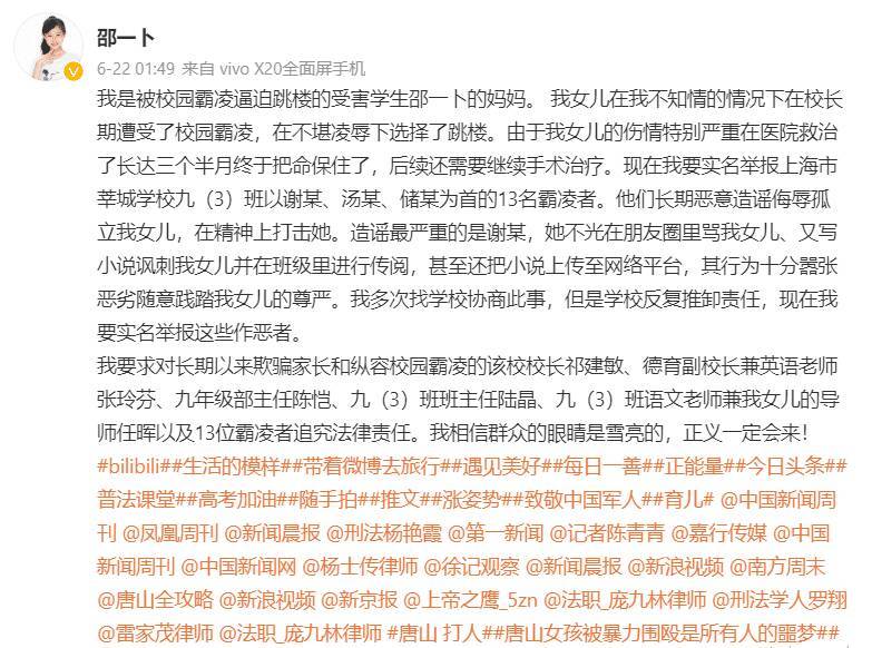 曾经参演过《筑梦情缘》、《银河补习班》等影视剧的童星邵一卜的妈妈尤永梅在微博上发文,吁求关注女儿因为遭受校园霸凌轻生跳楼的恶性事件,并实名举报了3名霸凌者和上海市莘城学校不作为的情况。