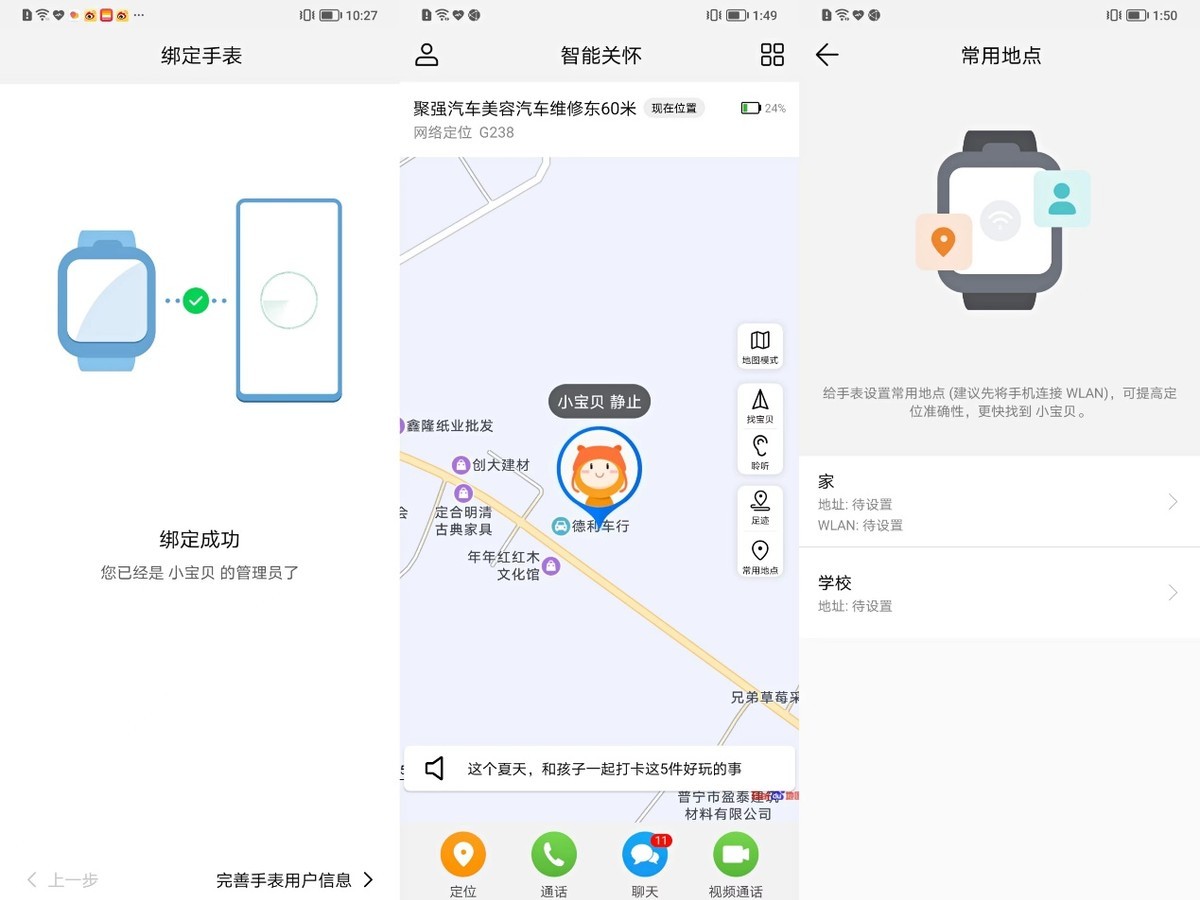 华为儿童手表 4 Pro多源融合网络定位技术,集成了华为自研的网络定位服务。华为儿童手表 4 Pro新款能够支持GPS+北斗+GLONASS三模卫星定位、WLAN定位、基站定位、室内定位,A-GPS、加速度计辅助定位、SOS辅助共9重定位,基于AI自学习算法还能够越用越精准,对于孩子经常去的学校、商场都会自动记录下来,家长在“智能关怀APP”上便可以轻松查看孩子当前所在的位置。