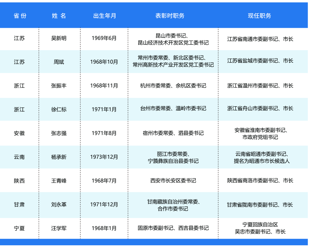 从省份分布来看,江苏有两位,浙江有两位,安徽、云南、陕西、甘肃、宁夏各一位。