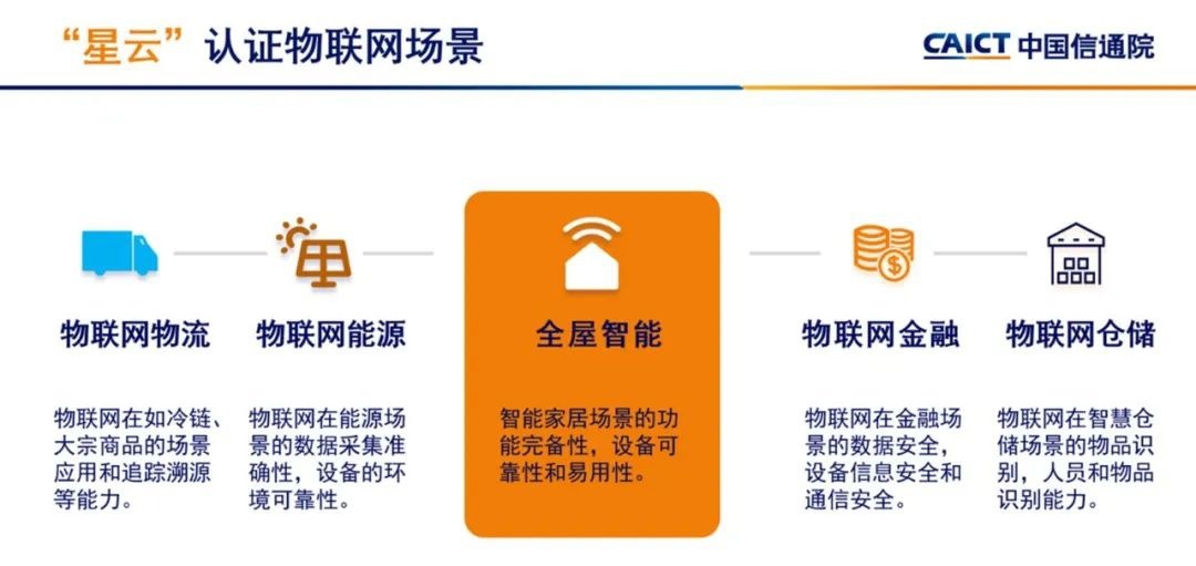 2022 年 7 月,中国信通院“星云”物联网认证-全屋智能场景认证将正式上线。官方称,全屋场景认证内容充分考虑了现阶段智能家具、数字家庭行业的发展,认证内容涵盖了交互系统、感知系统、联动系统、人工智能系统等多方面要素。