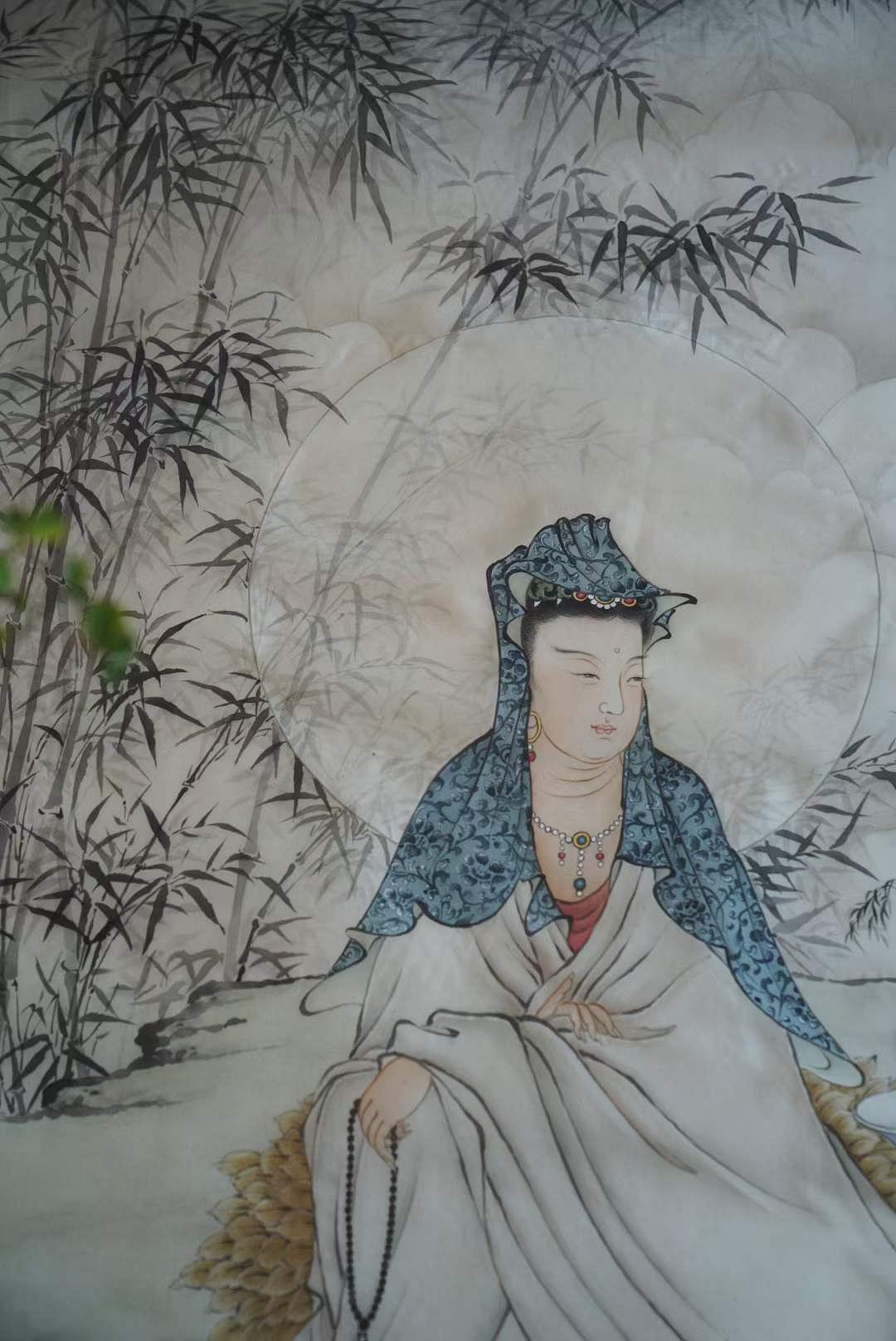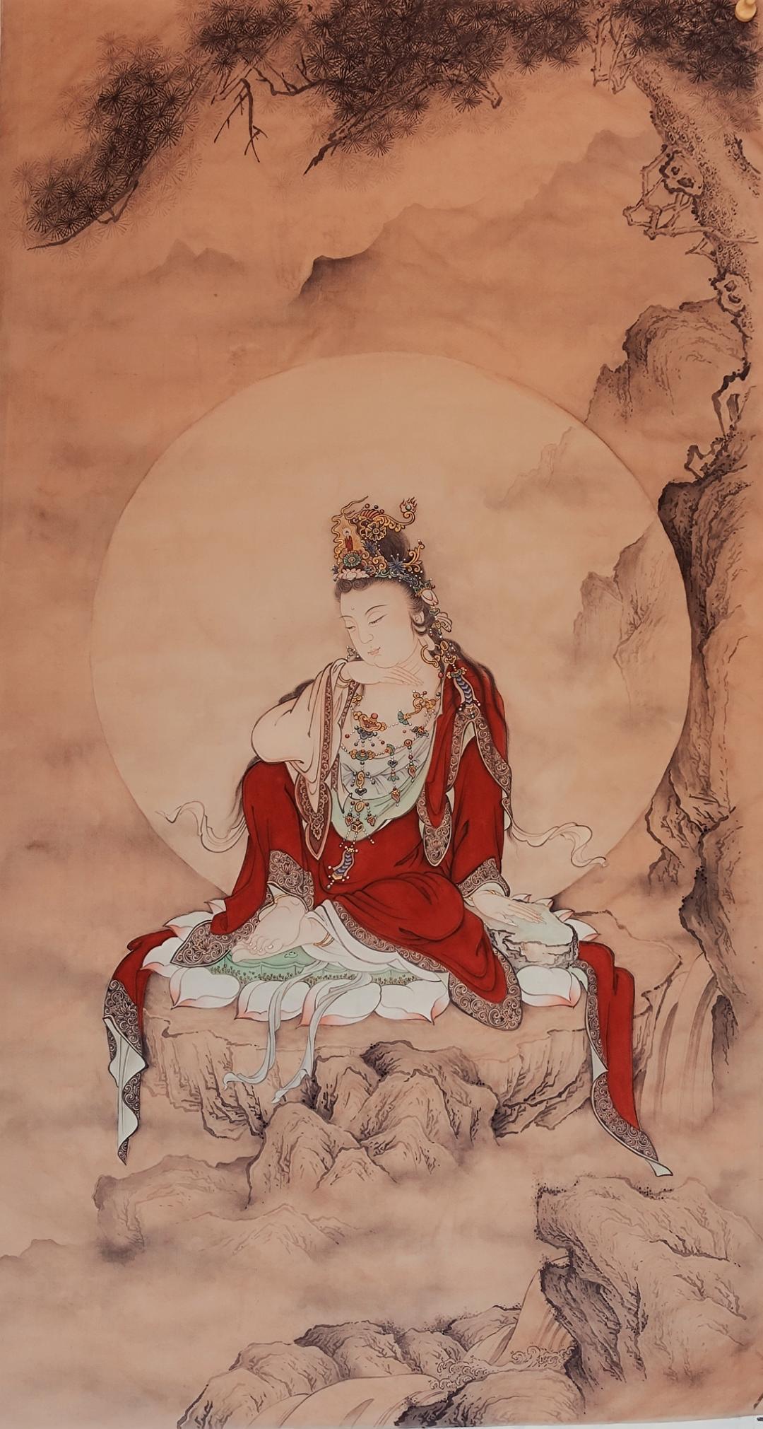 凝神观画,仿佛在静谧的山林间,明月当空、微风拂过,松枝沙沙作响。我问如意轮菩萨什么才是解脱?有几不可闻的渺渺禅音在耳边萦绕,如意轮菩萨似笑似语,等着我领悟关于世间真相的智慧。