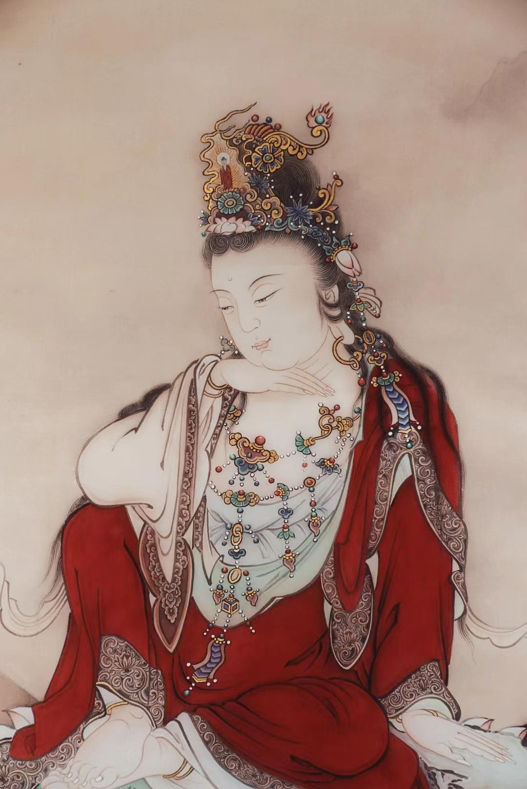 由隆德园倪老师绘制的这幅《南无如意轮菩萨》,以女相显示的如意轮菩萨,面容柔美慈祥,仪态从容淡然。据《如意轮瑜珈念诵法》载,尊者具六臂,全身金色。头上结宝顶髻,戴庄严冠,以示庄严,冠有化阿弥陀佛,住天说法相。