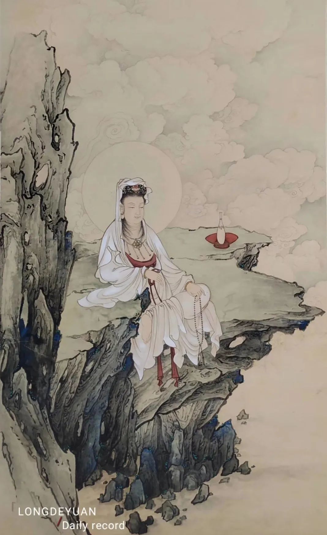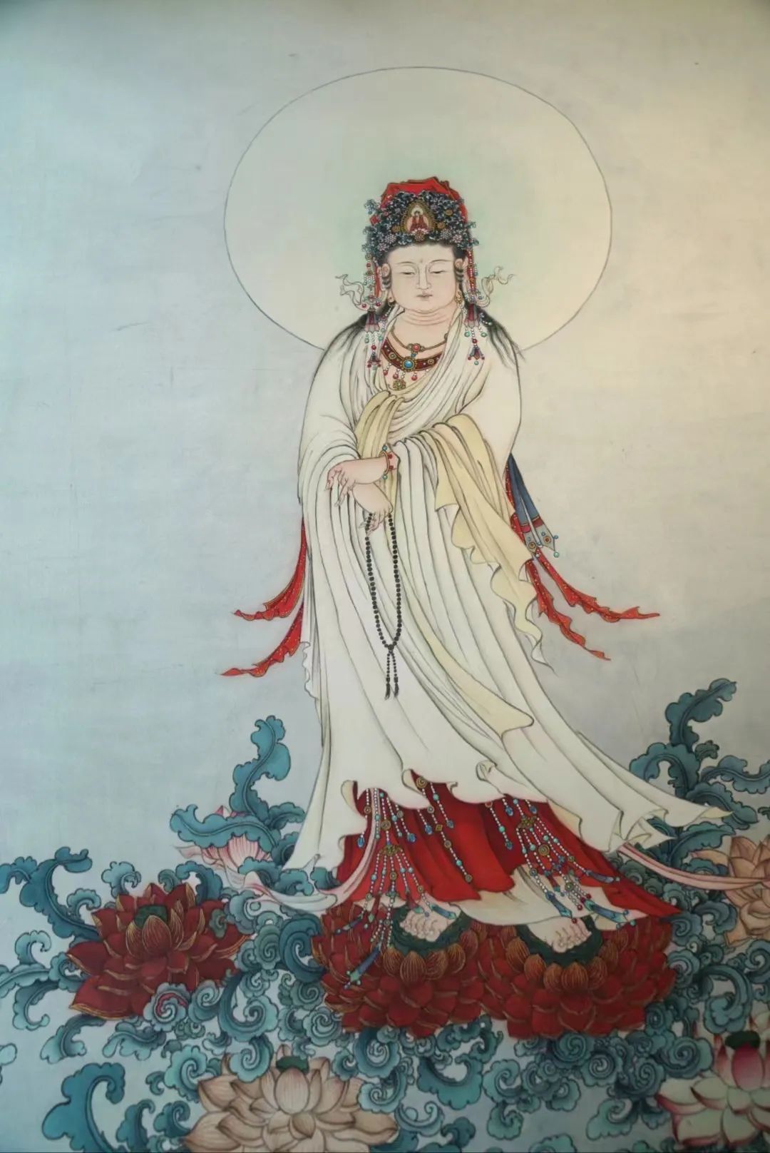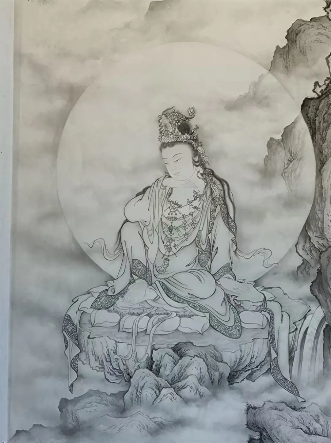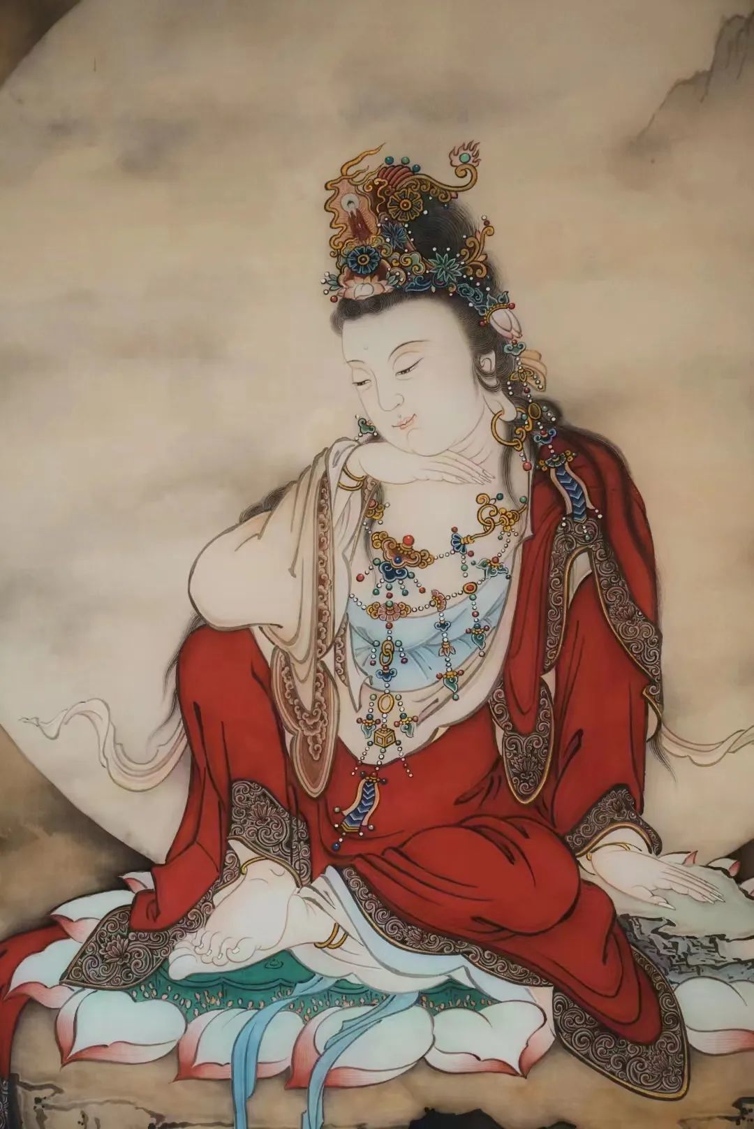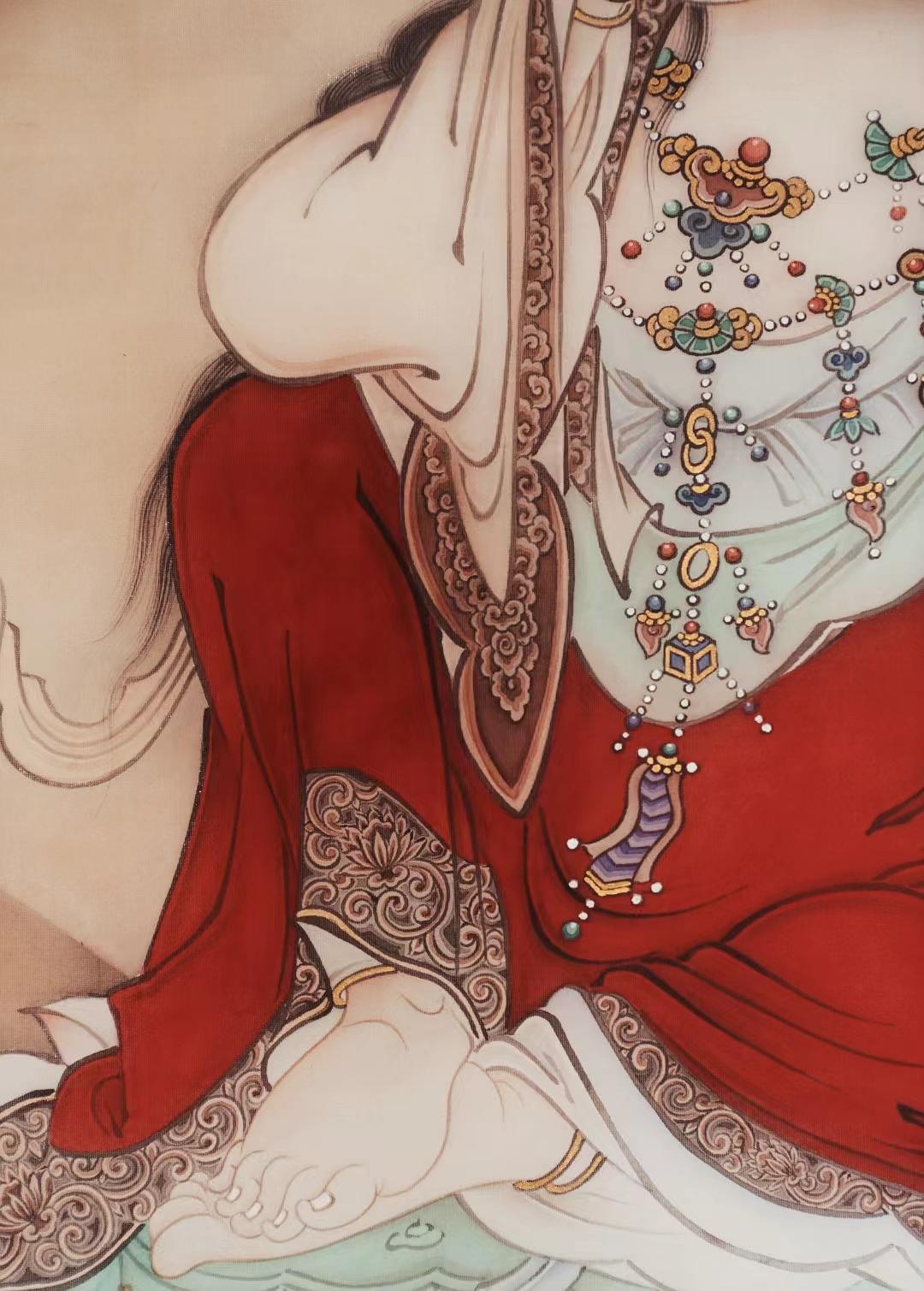 这幅《南无如意轮菩萨》没有选择如意轮菩萨常见的六臂像,画中的如意轮菩萨端坐莲座、俯首静思,仿佛正在聆听修佛者的祈愿,以柔美的目光和安宁的微笑示意。如意轮菩萨的双手和双足,显露出一种丰腴的美态,细腻洁白的手腕和足腕上均佩戴首饰,首饰在衣袖和裙裾的遮挡下若隐若现,给人一种柔嫩、纯真又安心的感觉,更体现出绘者在细节上的用心。倪老师这幅《南无如意轮菩萨》,如今已绘制了四稿,对画面细节的处理和画面整体的把握,每绘制一稿都有不同的认识与体悟。