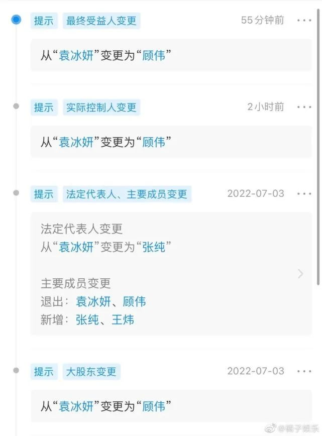 7月3日,袁冰妍本人退出该公司法定代表人、执行董事兼经理职位。