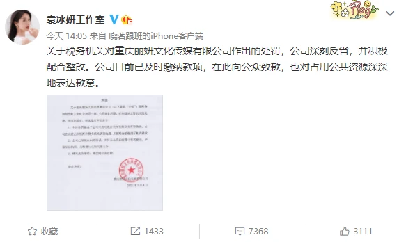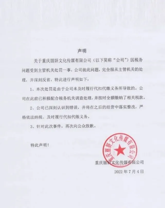 7月4日,天眼查App显示,近日,重庆丽妍文化传媒有限公司因逃税被罚约97.8万。袁冰妍工作室发声明回应称,本次处罚是由于公司未及时履行代扣代缴义务,已按时全额缴纳了相关税款,已经深刻认识到错误,向公众致歉,以后会严格依法纳税。