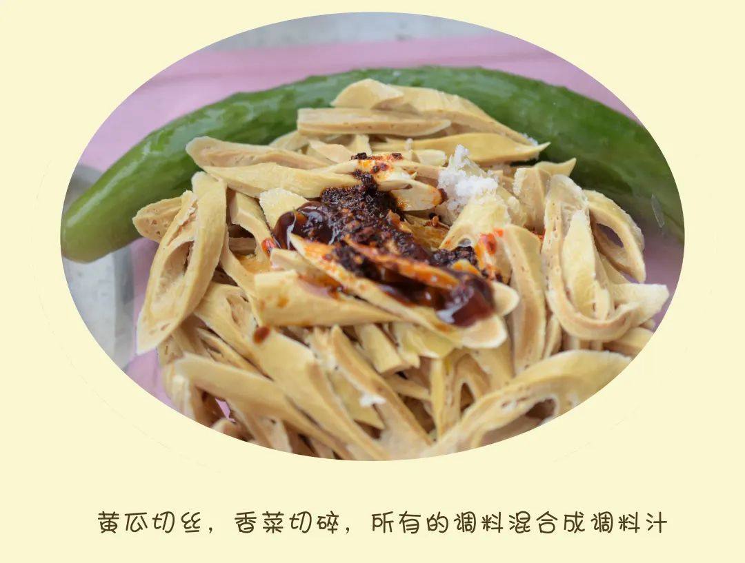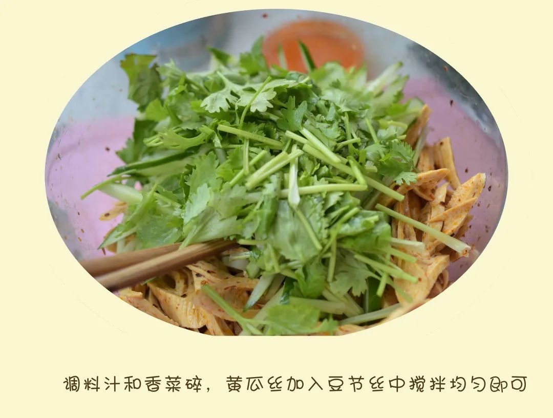 3,调料汁和香菜碎,黄瓜丝加入豆节丝中搅拌均匀即可