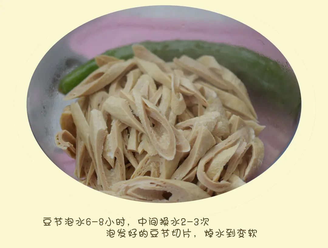 1,豆节泡水6-8小时,中间换水2-3次,泡发好的豆节切片,焯水到变软