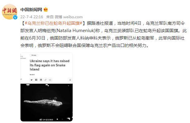 据路透社报道,当地时间4日,乌克兰军队南方司令部发言人胡梅纽克(Natalia Humeniuk)称,乌克兰武装部队已在蛇岛升起该国国旗。此前在6月30日,俄国防部发言人科纳申科夫表示,俄罗斯已从蛇岛撤军,此举向国际社会表明,俄罗斯不会阻碍联合国保障乌克兰农产品出口的相关努力。