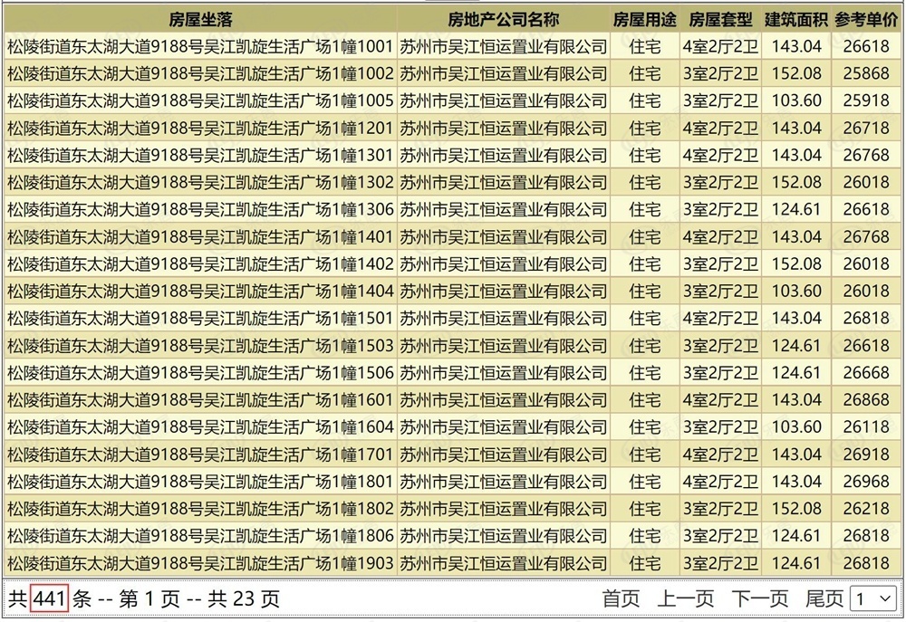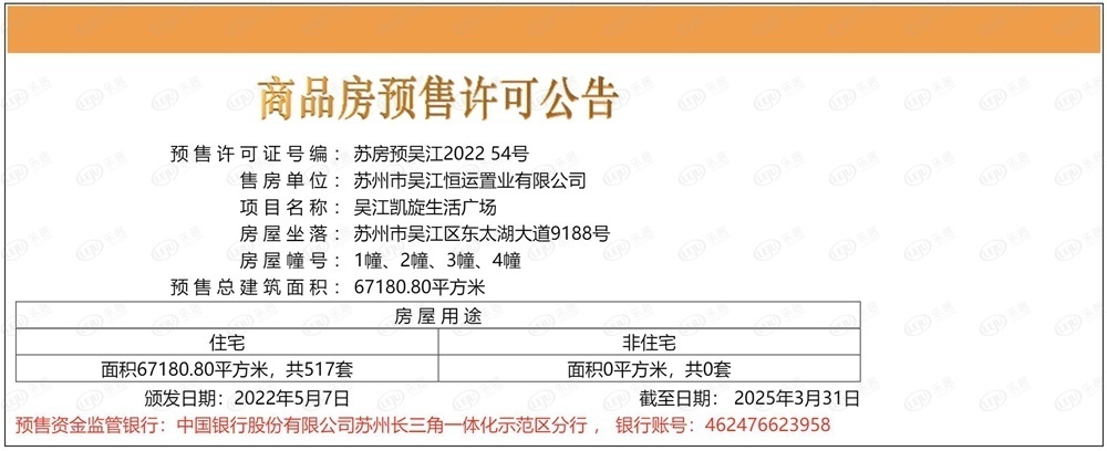 2022年5月7日,恒泰朗诗熙华府(备案名:吴江凯旋生活广场)一次性将其所有的517套住宅房源全部取证,备案单价约23468-27318元/㎡,整体均价约26100元/㎡,总价区间249-421万/套。