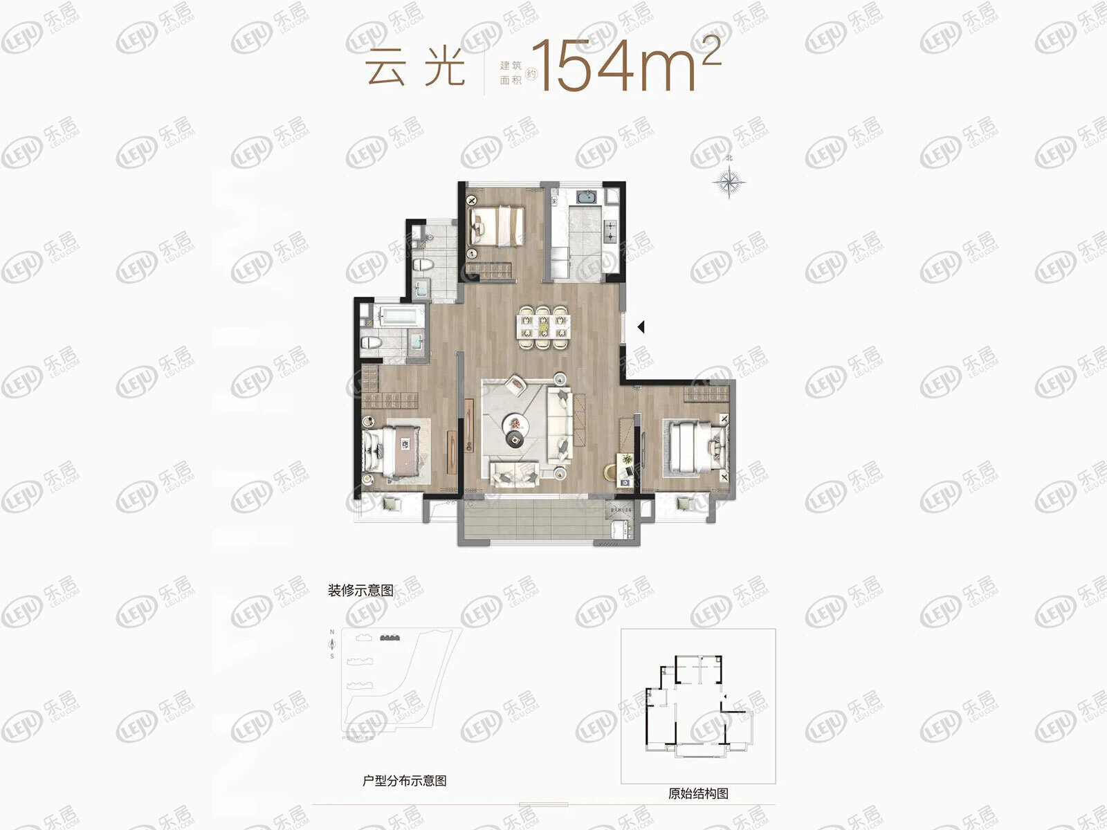 云光户型建面约154㎡,是项目最大户型,套内3室2厅2卫格局,大三房设计。
