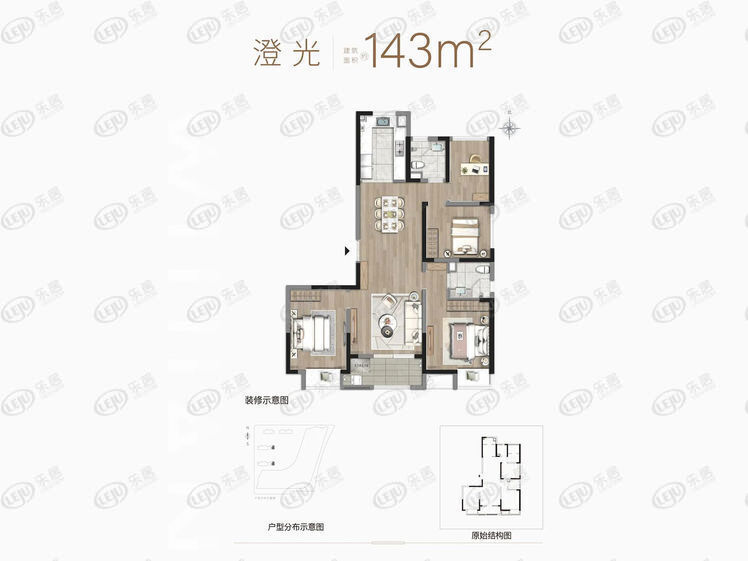 恒泰朗诗熙华府共有五种户型,分别为建面约104㎡、124㎡、143㎡、152㎡、154㎡!包括建面约152㎡、154㎡在内的四个户型为三居室设计,仅建面约143㎡是四居室房设计,同时也只有建面约143㎡户型是1梯2户,其他户型都是2梯4户。下面先以项目建面约143㎡澄光户型为例进行分析。