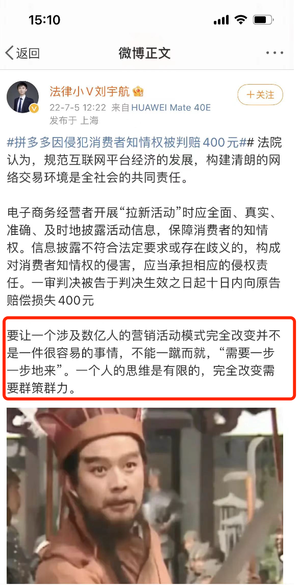 据了解,上文中提到的刘某某为上海律师刘宇航。7月5日下午刘宇航发微博表示,要让一个涉及数亿人的营销活动模式完全改变并不是一件很容易的事情,不能一蹴而就,“需要一步一步地来”。一个人的思维是有限的,完全改变需要群策群力。