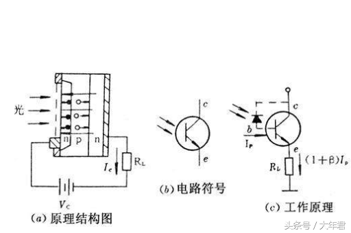 光敏三极管的结构与一般晶体三极管相似,其内部有两个PN结,其发射结与光敏二极管一样具有光敏特性,集电结与普通晶体管一徉可以获得电流增益,因此光敏三极管比光敏二极管具有更高的灵敏度.它在把光信号变为电信号的同时.还放大了信号电流、即具有放大作用。光敏三极管所用材料与光敏二极管材料相同,亦有PNP与NPN两种类型。如图是光敏三极管的原理结构图与电路图符号。
