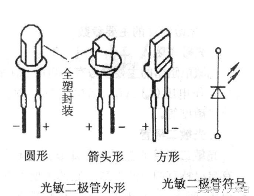 光敏二极管是一种采用PN结单向导电性能的结型光电器件,也叫光电二极管,能够将光信号变成电信号的探测器件,通过在PN结加上反向电压,在光的照射下反向导通,光敏二极管所用材料一般有硅、锗等。如下图是光敏二极管的外形结构与符号。
