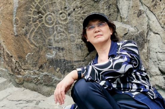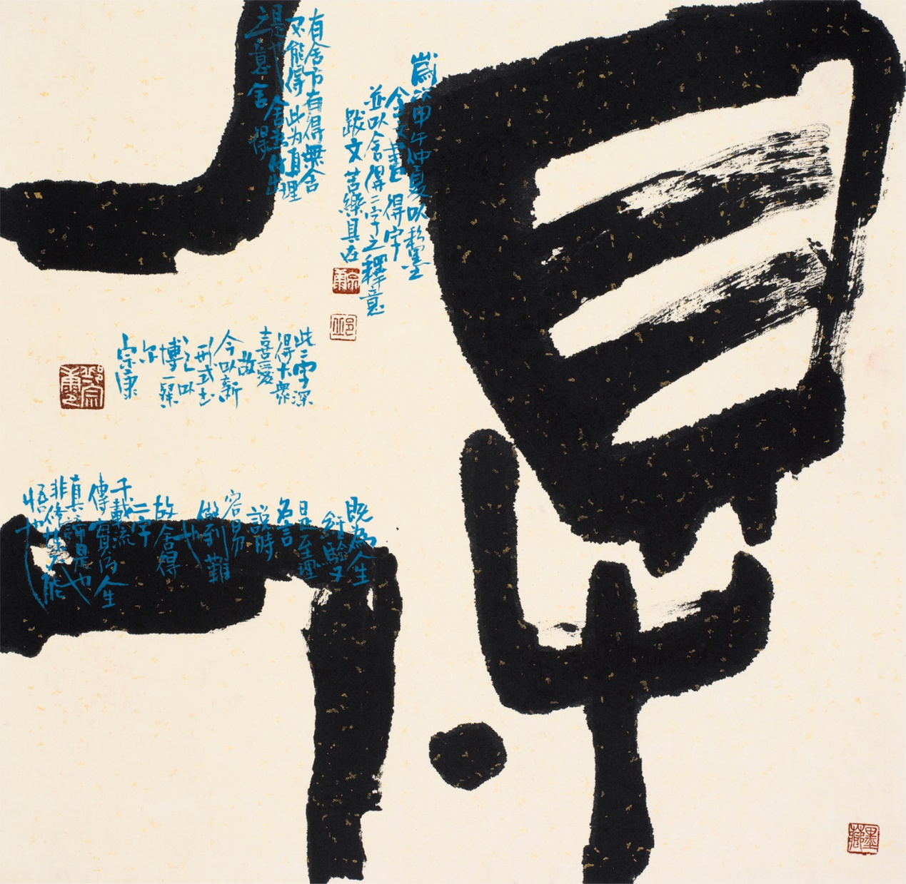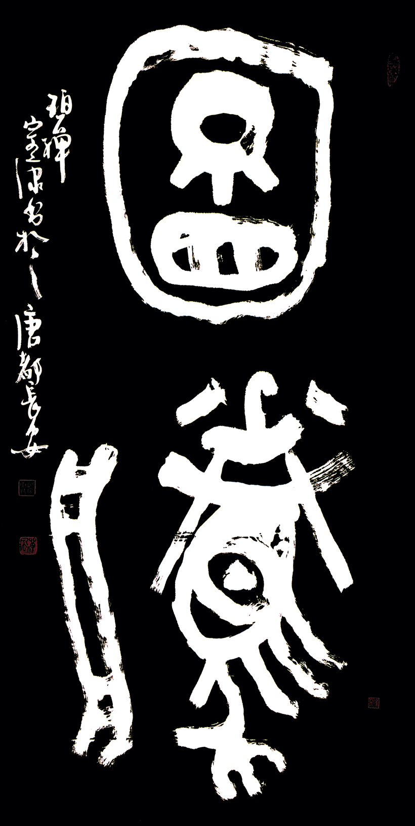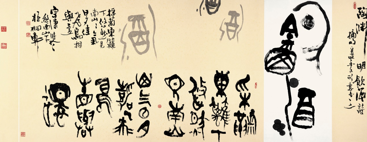 在保持商周青铜精神、吸纳汉唐开放风采的背景下,她潜心研创“墨彩金文”,以远古文字为载体,吸收古今中外一切可用之艺术营养,追求线条、结字、章法与色彩、绘画等多种审美元素互相融汇、彼此生发并高度统一的境界,表现出天然、古朴、自由、沉厚、极具生命力的“金文书法”艺术风格。