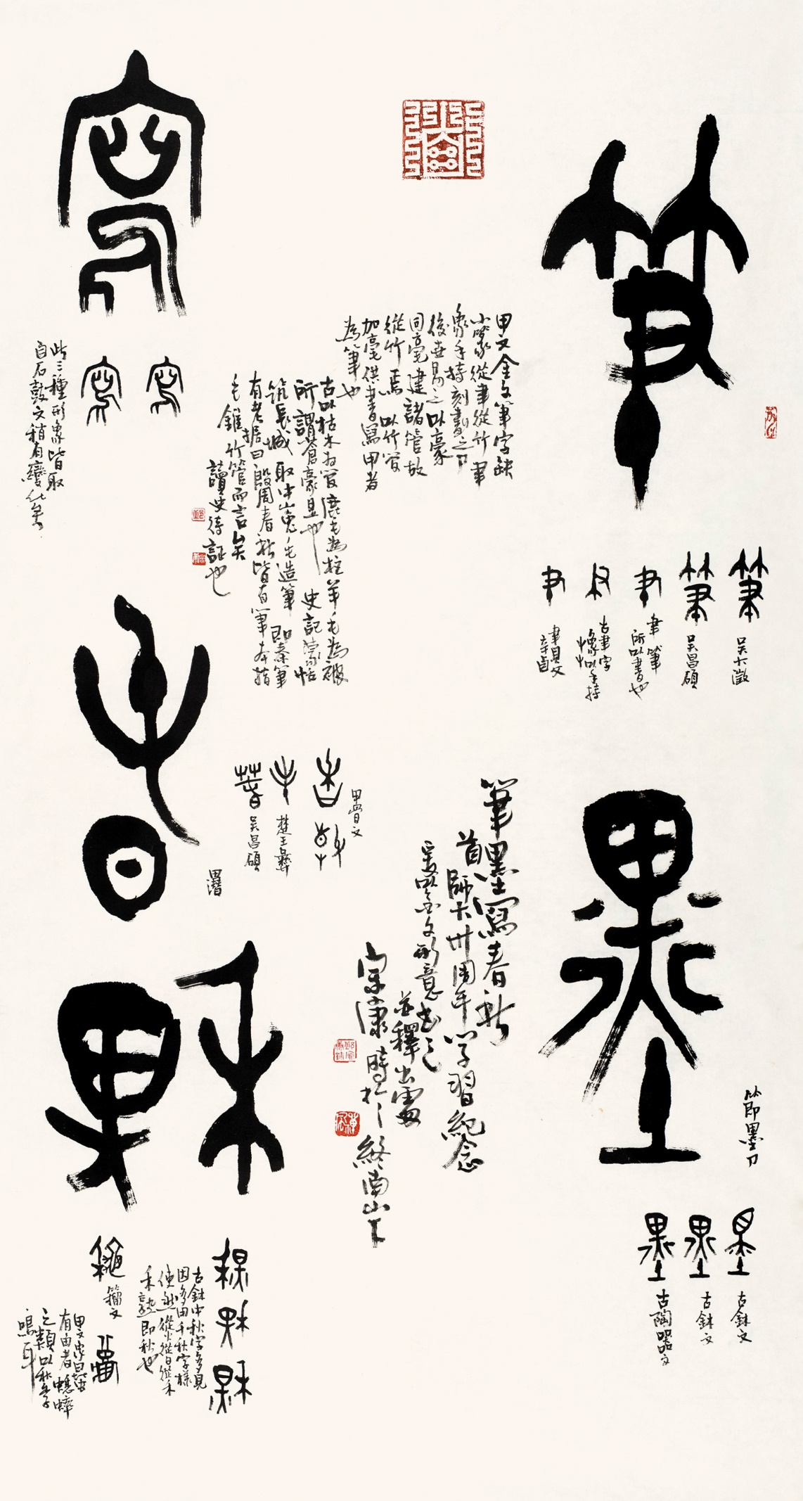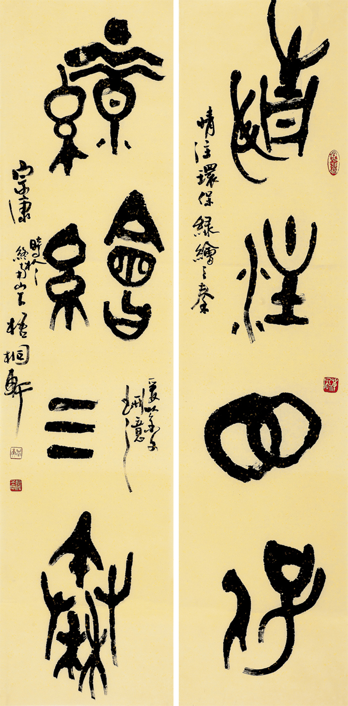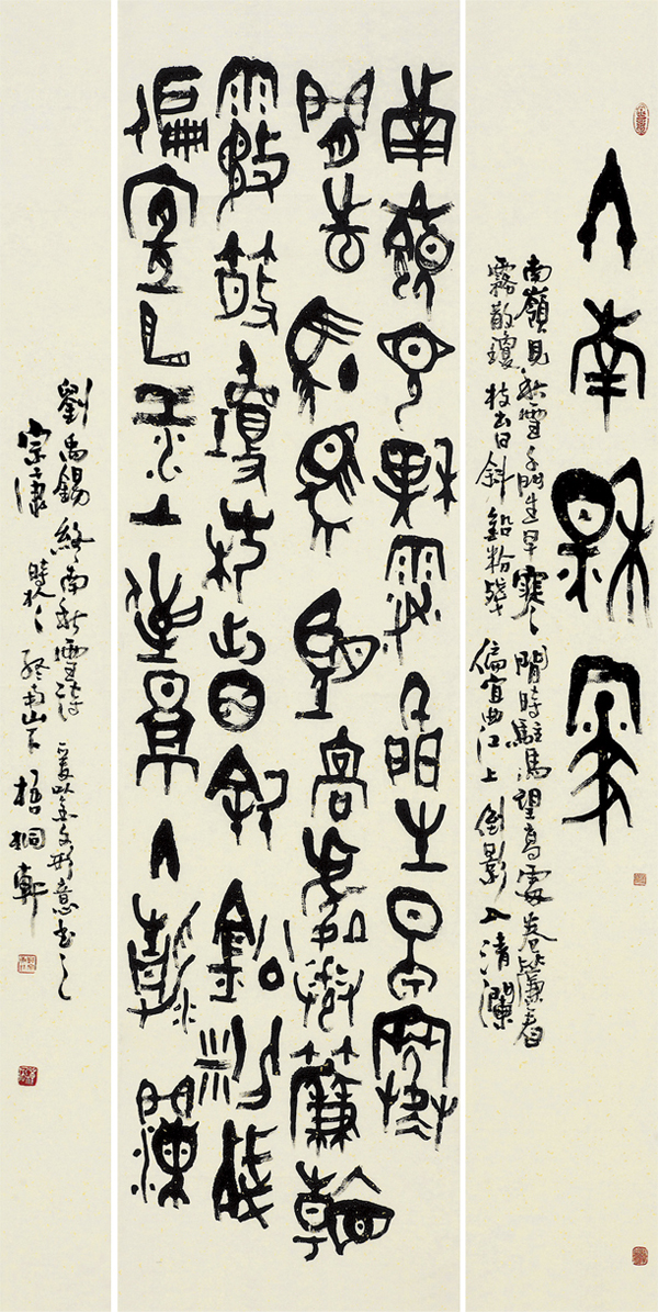 篆书作为中国书法源头上的一种符号,它的审美价值和实用价值早已剥离,不再进入现代符号传播的运作流动体系。虽然如此,艺术生命却并不僵滞,一直在随时代和审美的流变不断变化、不断更新。篆书在先秦已有几度变化,郭沫若曾将这一时期青铜器(包括金文书法)分为四个变化期,谓滥觞期、勃古期、开放期、新式期,以表明青铜艺术和金文生机勃勃的发展历程。郭老的活,李泽厚在《美的历程》中曾大段引用,并认为30年来这依然是可资遵循的看法。进入近代,邓石如的隶笔入篆,寓笔墨趣味于上古符号之中;吴大 的以鼎籀入小篆,书风又有一变。