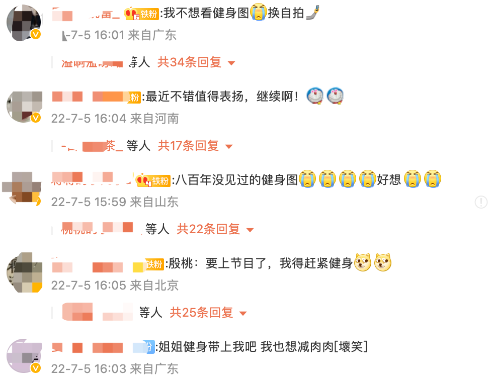 在看到殷桃的健身照片之后网友们也是纷纷在评论区表示好久没有见到殷桃健身了,猜测是不是要上节目了所以就开始健身了。