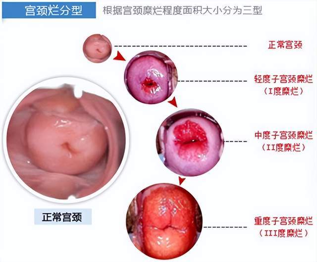 因雌激素水平升高而导致的宫颈“糜烂”为假性,属于一种常见的生理性改变。但是,柱状上皮抵抗力较弱,被各种细菌和病原体侵入,出现白带增多、有异味、瘙痒、同房出血等症状,这就是真性“糜烂”了。依据宫颈糜烂面积大小分成三度: 轻度指糜烂面积不超过整个宫颈面积的1/3;中度指糜烂面积占整个宫颈面积的1/3~2/3; 重度指糜烂面积为整个宫颈面积的2/3以上。