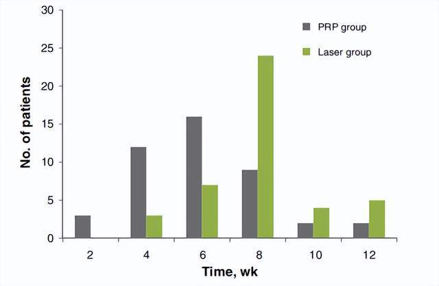 在另外一项研究中纳入120例符合条件的患者,分为PRP组及激光治疗组,PRP组采用PRP凝胶覆盖于宫颈糜烂表面。结果显示PRP组平均再上皮化完成时间为6.41±2.05周,显著短于激光组的8.28±1.72周(P<0.01)(图1)。并且,PRP组治疗的不良反应发生率远低于激光组(P<0.01)。